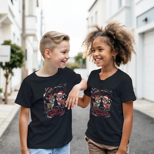 Cute Reindeer Couple Kids Christmas T-Shirt – Classic Crewneck Holiday Tee