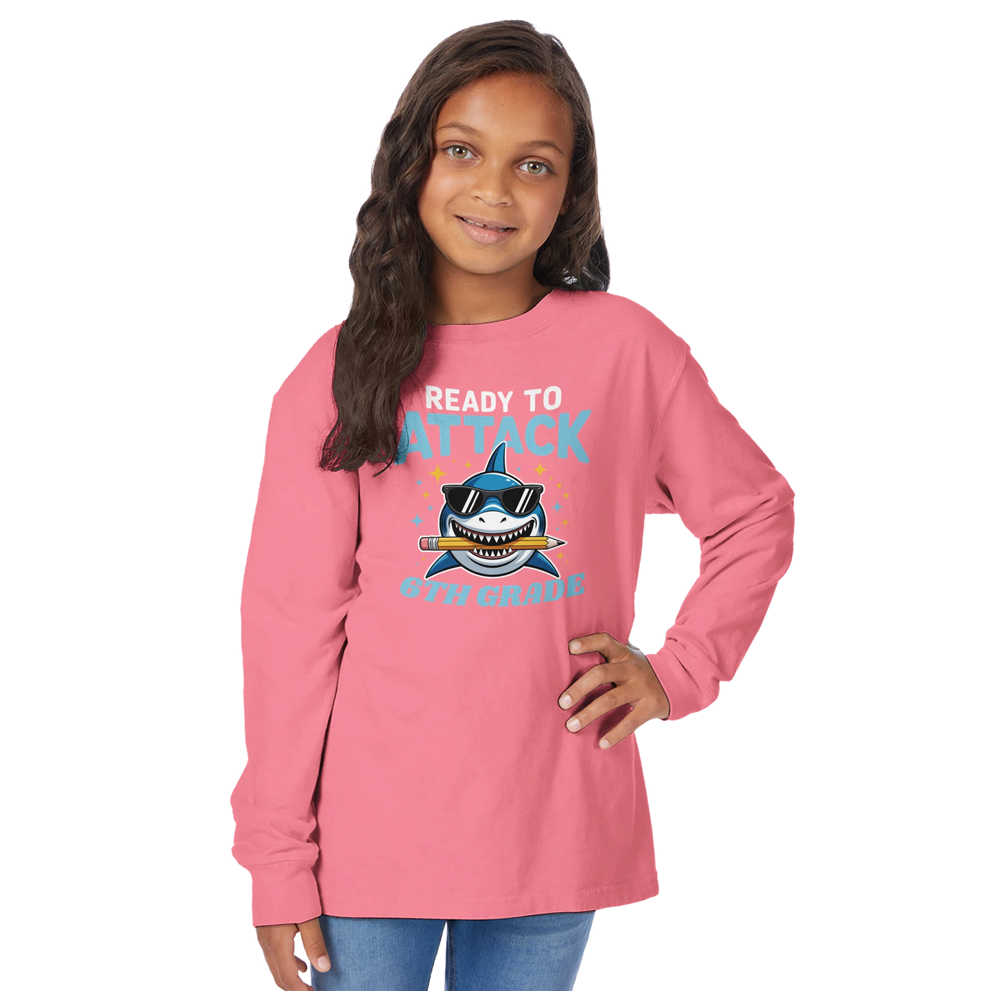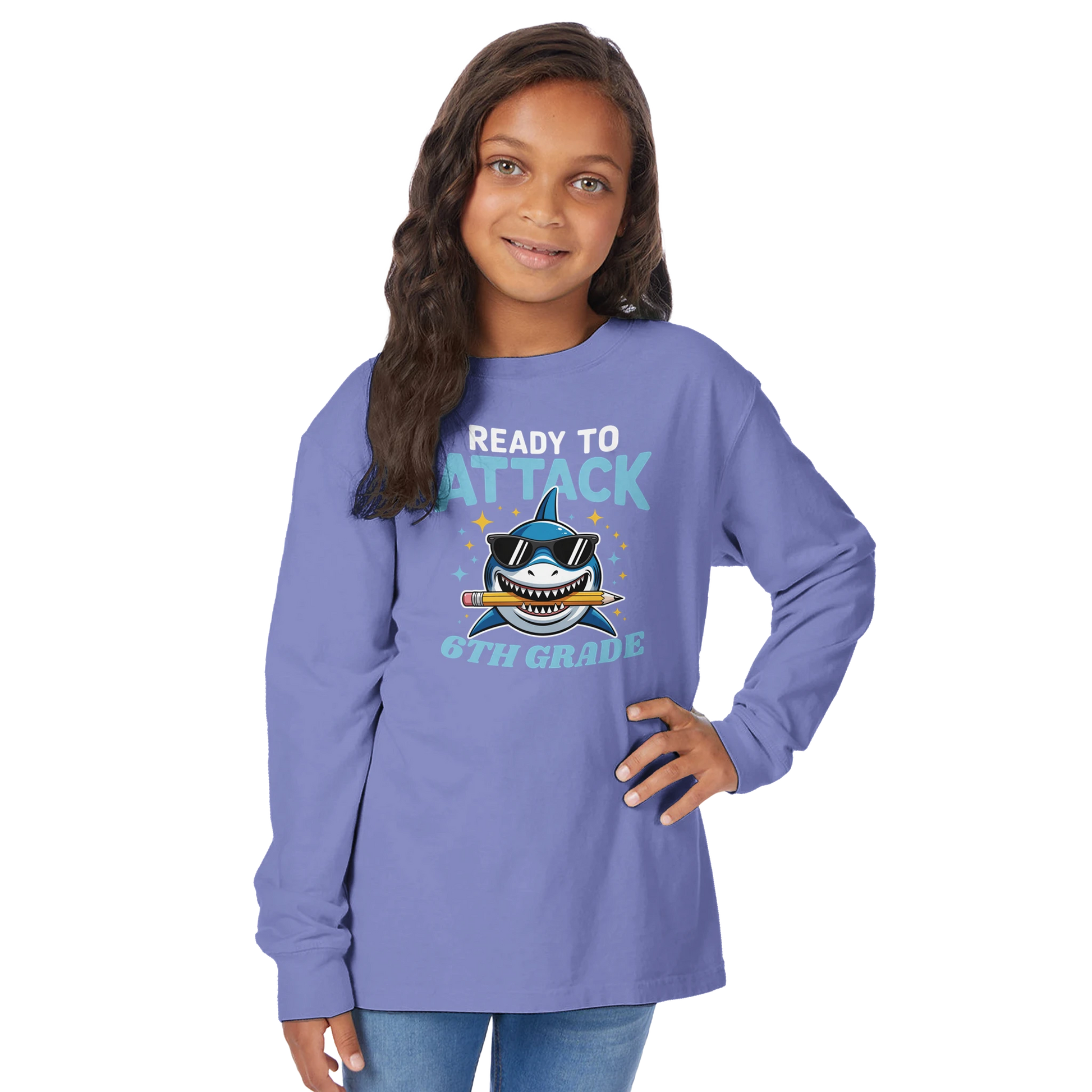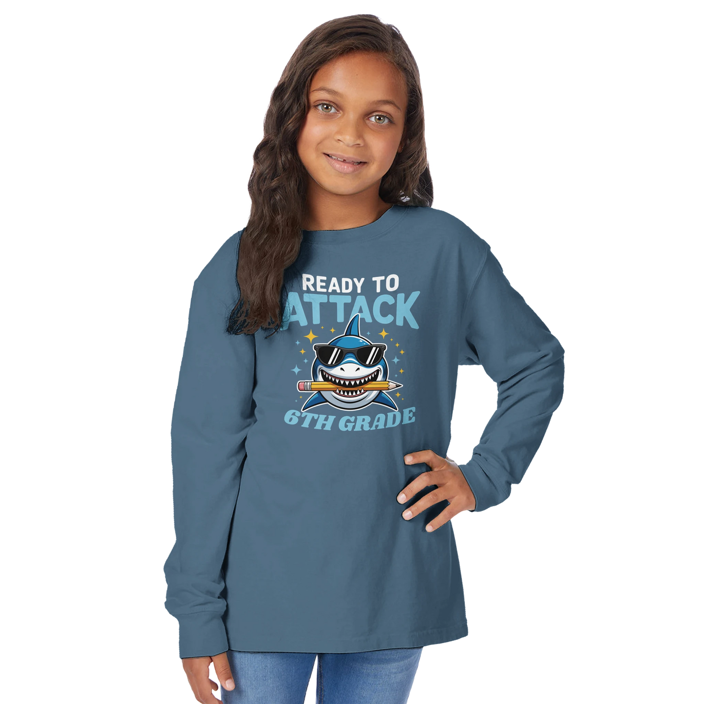 Kids Long Sleeve Crewneck T-Shirt – "Ready to Attack" Blue Shark – Customizable for 1st to 6th Grade – Bold & Fun School Shirt