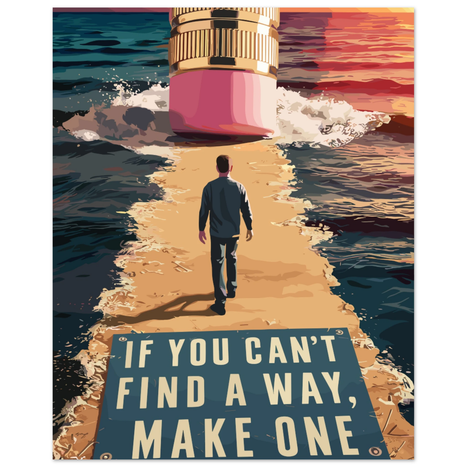 Discover the power of creativity and determination with this striking fine art poster, featuring a unique 3D render of a scene where a giant eraser at the end of a pencil erases the sea, revealing dry land for a man to walk on. The pencil, positioned ahead of the man, symbolizes the path he must take, while he walks towards it, embodying the idea of forging your own way.
