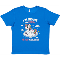Bring a touch of magic and motivation to your child’s wardrobe with our Premium Kids Crewneck T-shirt featuring a kawaii unicorn design. This adorable cartoon-style unicorn has a rainbow-colored mane in blue, yellow, and purple, a golden horn, a pink and purple tail, and a joyful expression. Surrounded by white clouds, yellow stars, and a black starry background, it carries the empowering text "I’M READY" in white and "TO CRUSH" in pink – perfect for inspiring confidence at school or play.
