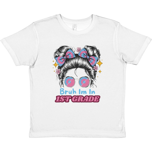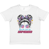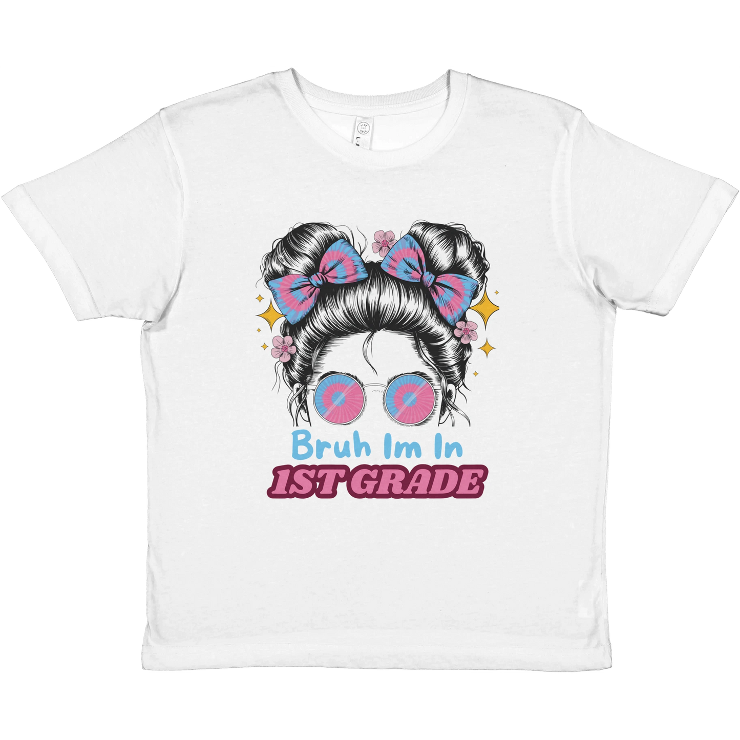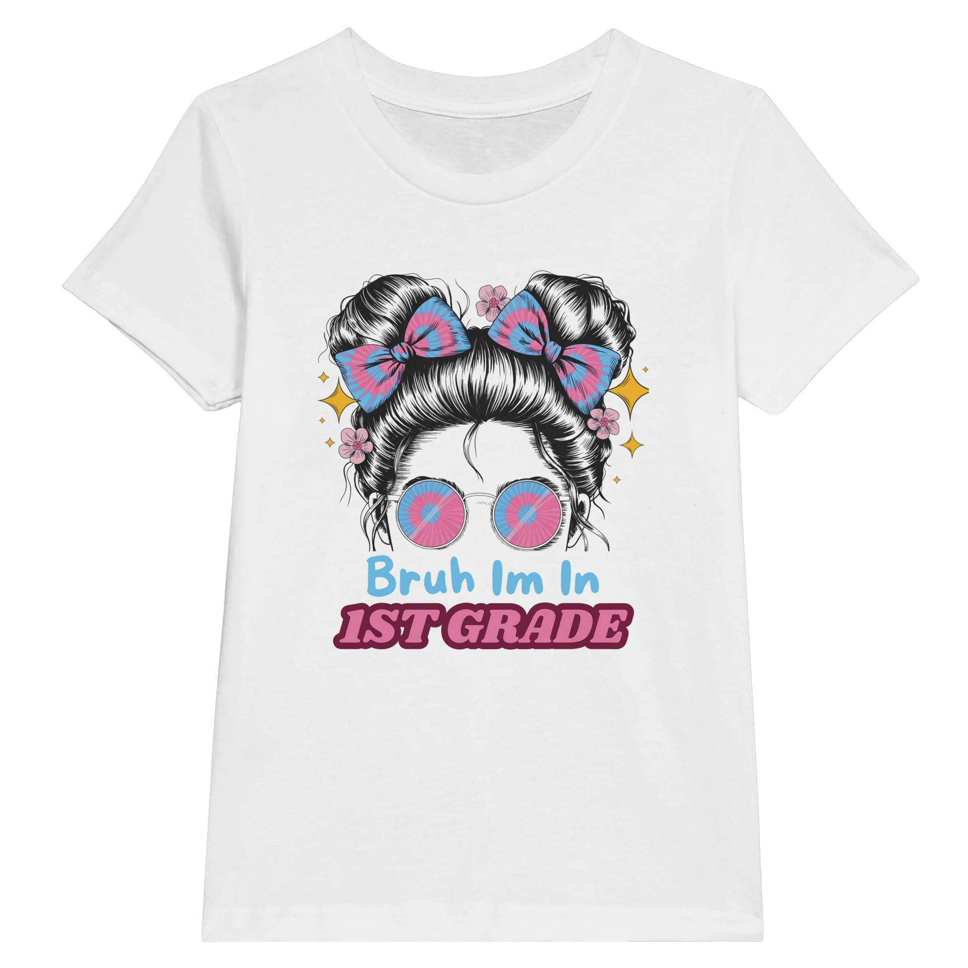 Premium Kids Crewneck T-Shirt White – "Bruh I'm in [Grade] Grade" – Customizable with Messy Bun Tie-Dye Design – 1st to 6th Grade