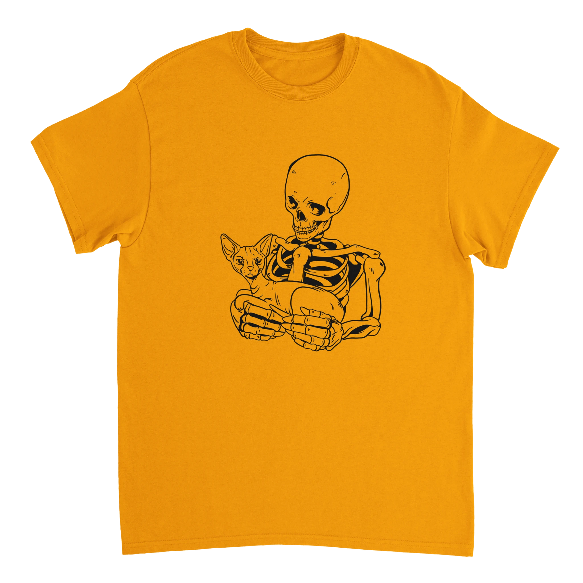 Skeleton with Cat Halloween T-Shirt – Gothic Sphynx Cat Graphic Tee | Heavyweight Unisex Crewneck