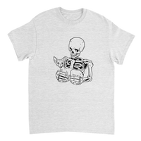 Embrace the spooky and stylish side of Halloween with our Skeleton with Cat T-Shirt! . Featuring a detailed gothic illustration of a skeleton holding a Sphynx cat, this design is perfect for cat lovers, goth fashion fans, and anyone who enjoys unique dark art.