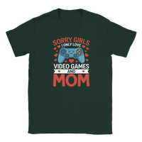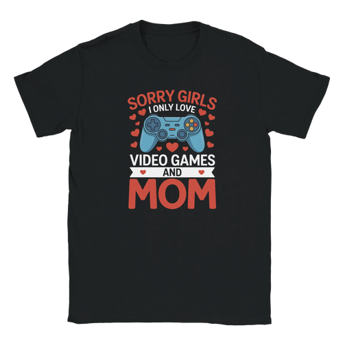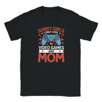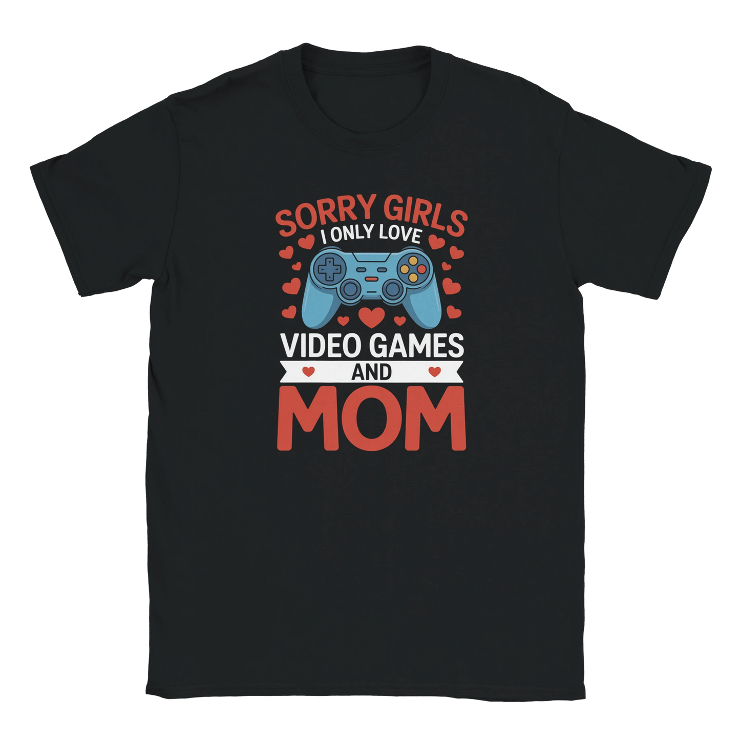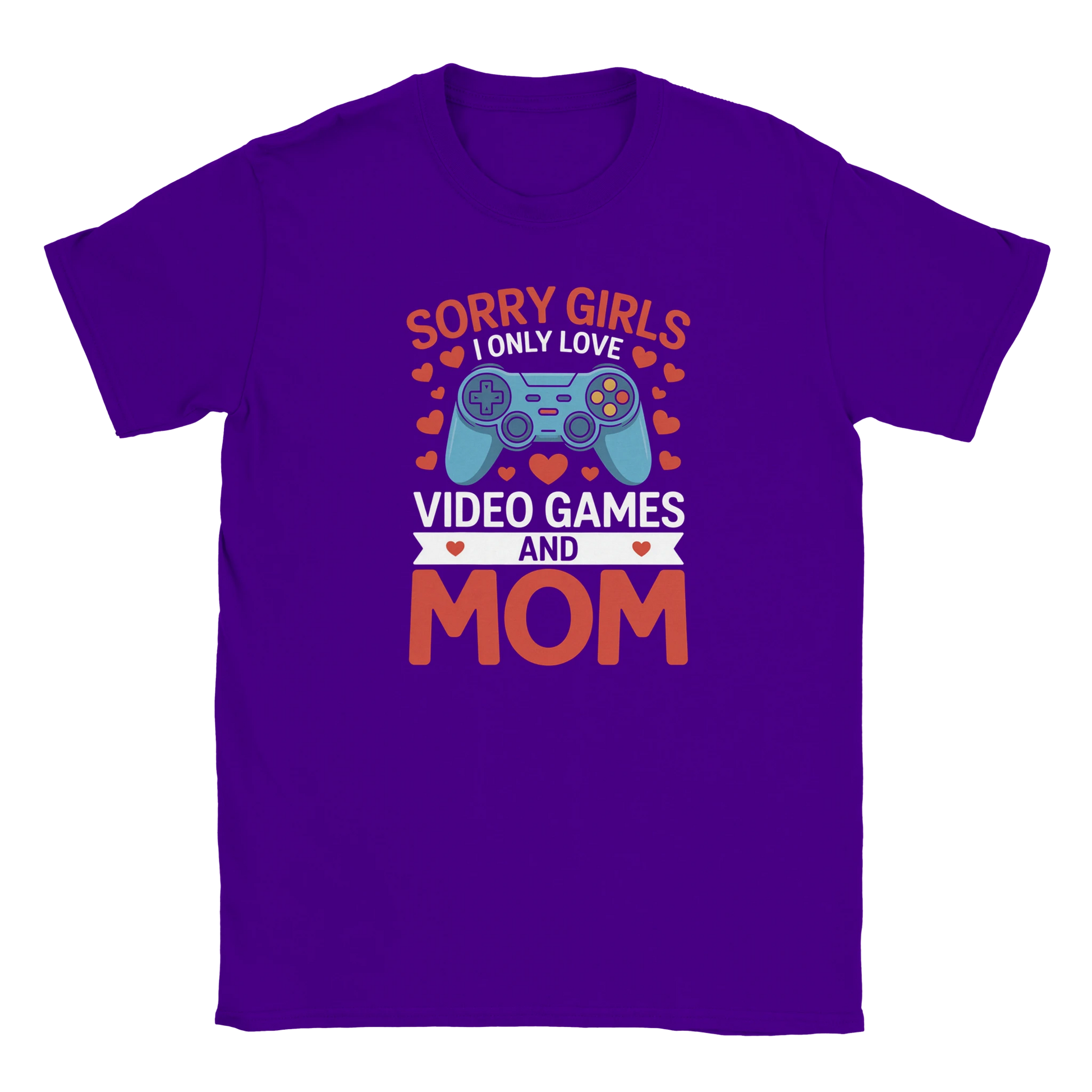 Funny Gamer Design – “Sorry Girls, I Only Love Video Games and Mom” graphic for boys & girls.